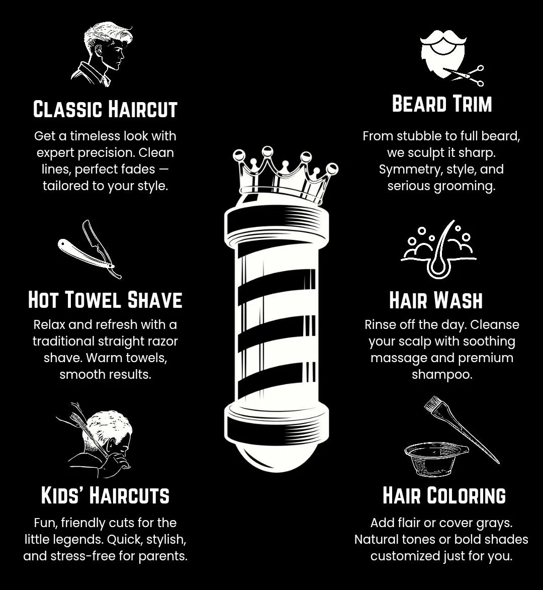 We offer a wide range of services, including haircuts, beard trimming, shaving, and facials. We also offer a variety of styling products for purchase.